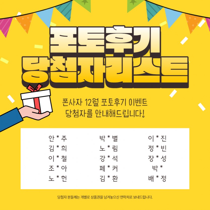 폰사자소식 12월에 포토후기 작성해주신 이벤트 당첨자 안내 작성일24.01.09 14:33 | 조회수 1,679 12월에 작성해주신포토후기 당첨자 안내입니다.안*주, 김*희, 이*철, 조*아, 노*헌박*별, 노*림, 강*석, 페*커, 김*환이*진, 정*빈, 장*성, 박*, 배*정포토후기 이벤트에 참여해주신 모든 분께 감사드리며,선정되신 분께는 순차적으로 모바일 상품권이 발송됩니다. 이전글2월 카드사 무이자 할부 혜택 다음글1월 카드사 무이자 할부 혜택 목록