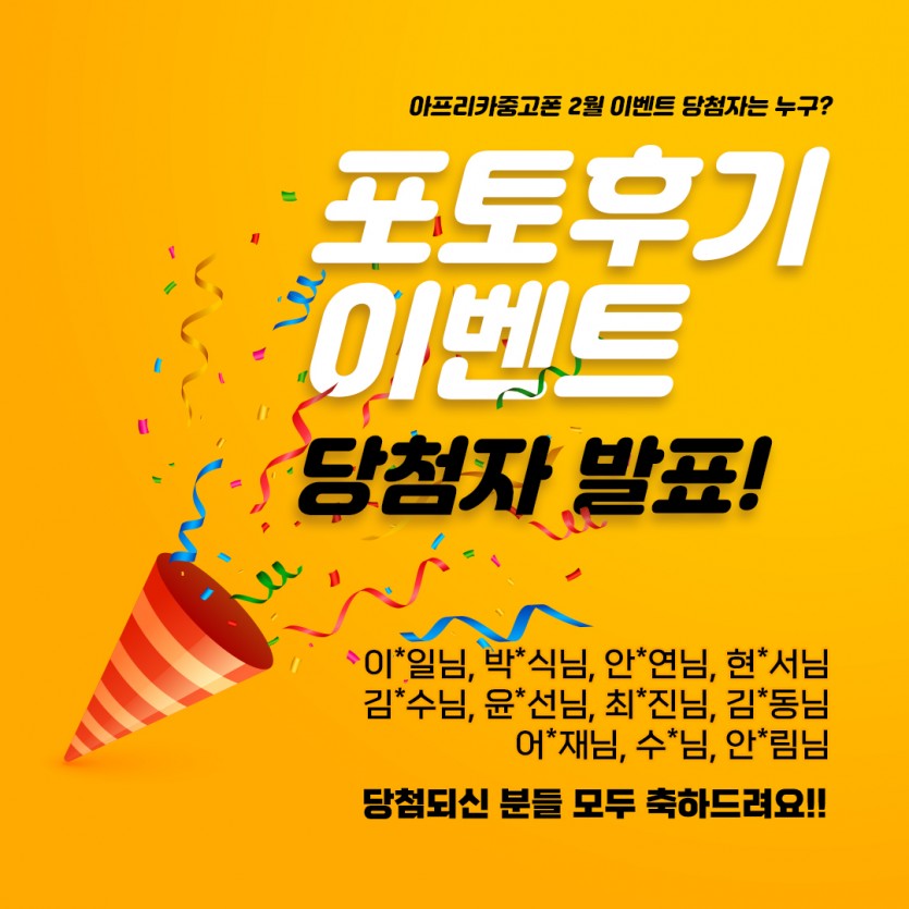 이벤트 2월 포토후기 당첨자 안내 작성일23.03.09 15:43 | 조회수 1,337 2월 당첨자 안내입니다. 이*일님, 박*식님, 안*연님, 현*서님김*수님, 윤*선님, 최*진님, 김*동님어*재님, 수*님, 안*림님포토후기 이벤트에 참여해주신 모든 분께 감사드리며, 선정되신 분께는 순차적으로 모바일 상품권이 발송됩니다. 이전글1차 다사자경매 낙찰자 공지! 다음글23년 1월 첫번째 포토후기 이벤트 당첨자 안내! 목록